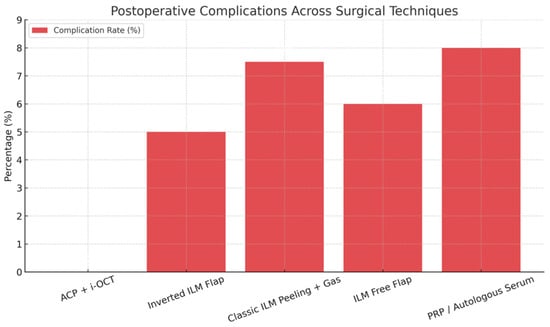 In two cases, a reduction in best corrected visual acuity of three or more Snellen lines was observed at both day 7 and 12-month follow-up. In both instances, retinal pigment epithelium (RPE) dysfunction was identified as the primary limiting factor. No intraoperative complications or reopenings were reported. A comparison of surgical outcomes and complications using different techniques is shown in Figure 4 and Figure 5.