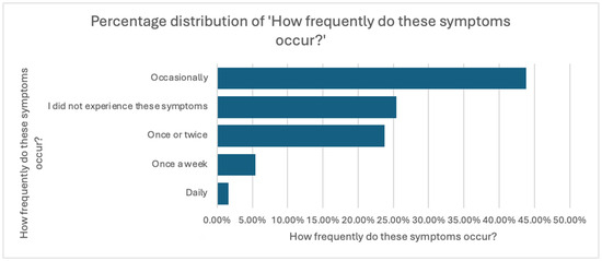 Regarding frequency, 43.8% of symptomatic participants reported symptoms occurring occasionally, 23.8% experienced them only once or twice, while 5.4% and 1.6% experienced symptoms weekly or daily, respectively. Interestingly, 25.4% indicated that they had never experienced such symptoms.