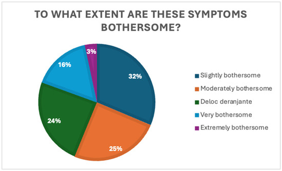 Despite the low rate of medical consultation, the perceived impact of symptoms was notable: 31.4% of respondents found the symptoms mildly bothersome, 24.9% reported them as moderately bothersome, and 16.2% reported them as very bothersome. Only 3.2% rated their symptoms as extremely disturbing, while only 24.3% stated that the symptoms did not interfere at all with their daily lives. Figure 3 shows the distribution of perceived symptom burden.