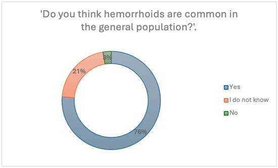 When asked whether they believe hemorrhoids are common in the general population, many respondents (76.2%) answered “Yes”, while 21.1% stated “I don’t know”, and only 2.7% answered “No”, as shown in Figure 6. This suggests a relatively high level of public awareness regarding the prevalence of hemorrhoidal disease.