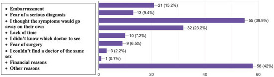 Other less frequently reported barriers included not knowing which specialist to consult (7.2%), fear of surgery (6.5%), inability to find a same-sex physician (2.2%), and financial concerns (0.7%).