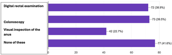 When asked which types of investigations might deter them from seeking medical care, participants most frequently indicated colonoscopy (39.5%) and digital rectal examination (38.9%) as procedures associated with hesitation, as seen in Figure 9. Visual inspection of the anus was a reported deterrent by 22.7% of respondents. Notably, 41.6% of participants selected “None of the above”, indicating that for a considerable portion of the population, diagnostic procedures alone may not constitute a barrier to medical consultation.