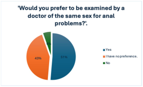 When directly asked whether they would prefer to be examined by a physician of the same sex for anorectal issues, 51.4% of respondents answered affirmatively, while 43.2% stated that they had no specific preference, and only 5.4% indicated a clear opposition to such a preference, as shown in Figure 10.