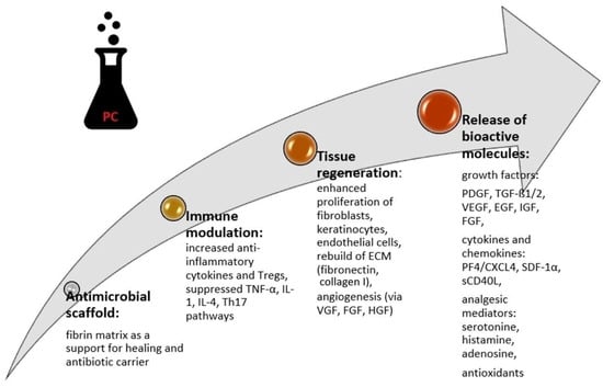 In the study where MMF was used as an additional control, the treatment efficacy was also comparable in all study groups [34]. High treatment efficacy in OLP, similar to topical tacrolimus, was demonstrated in Huang et al.’s [39] study of PRP in gel. The comparable effects of PCs and steroids can be explained by the anti-inflammatory potential of both of these therapeutic strategies. Corticosteroids stimulate an anti-inflammatory response in oral keratinocytes and present the ability to locally regulate T-lymphocytes [46]. Meanwhile, PRF inhibits the action of TLR4+ cells, which are primarily expressed in macrophages, dendritic cells, and some epithelial cells. These cells recognize lipopolysaccharides. In this way, it also promotes and triggers an anti-inflammatory response. PRF reduces the activation of TLR4 and blocks the classical inflammatory-related signaling cascade, mainly via the inhibition of p-p65. For these anti-inflammatory properties, PRF may serve as an effective alternative therapeutic approach in OLP [42]. The biologic actions of PCs are presented in Figure 1.