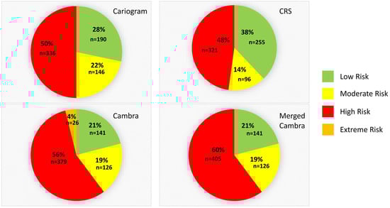 In Figure 1, it can be observed that the Cariogram classified 28% of the patients (190 individuals) as low risk, while CRS classified 38% (255 patients) and CAMBRA classified 21% of the total evaluated individuals (n = 141) in this risk group. For the intermediate risk group, the Cariogram classified 22% of the population (146 individuals), while CRS and CAMBRA classified 14% (96 patients) and 19% (126 patients), respectively. Finally, 50% of the sample (336 patients) were classified as high caries risk according to the Cariogram, 48% (321 individuals) using CRS, and 60% (405 individuals) when merged CAMBRA was employed (high and extreme risk merged). According to this latter evaluation method, it is possible to differentiate between 56% of patients with high risk (n = 379) and the remaining 4% with extreme risk (n = 26).