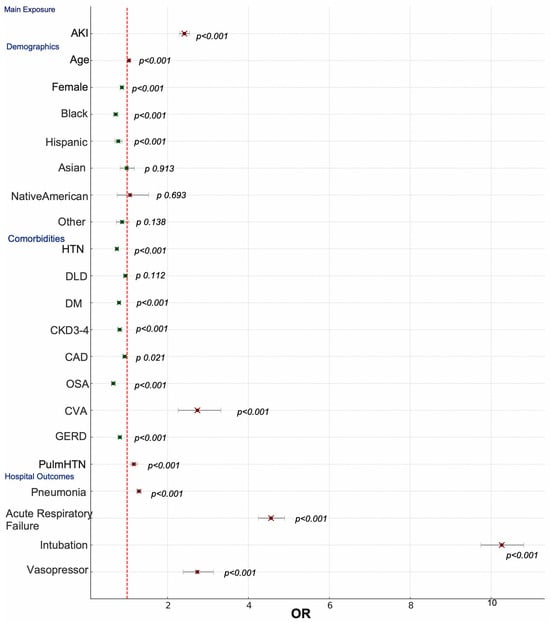 Forest plot of mortality risk factors in COPDe patients with AKI. HTN—hypertension; DLD—dyslipidemia; CKD—chronic kidney disease; CAD—coronary artery disease; OSA—obstructive sleep apnea; CVD—cerebral vascular disease; GERD—gastroesophageal reflux disease; Pulm HTN—pulmonary hypertension. The dashed vertical line represents the null value (OR = 1). Green square within the CI indicate variables associated with a protective effect (OR < 1) while the Red indicate variables associated with a higher mortality risk (OR > 1).