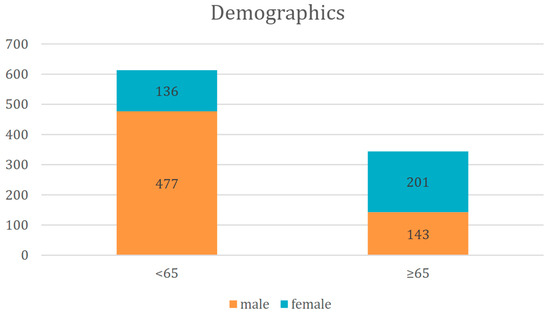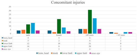 Among 957 patients, detailed data on the localization of concomitant injuries were available for 75 individuals. Notably, all 75 cases with documented concomitant injuries were hospitalized in external departments of the University of Pécs, primarily in the traumatology, otorhinolaryngology, or neurosurgery units (Figure 6). These records allowed for subgroup analyses based on both sex and age. The injury patterns differed notably by both sex and age. Elderly patients (≥65 years) most frequently sustained lower limb injuries (n = 31), which were almost exclusively absent in the younger group (<65 years). Upper limb injuries were also more common among the elderly (n = 20 vs. n = 2), while head/brain and trunk injuries were relatively evenly distributed. Females experienced more lower limb injuries (n = 19) than males (n = 12), whereas males showed a slightly higher frequency of upper limb and trunk trauma.