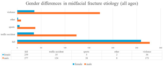 Gender-specific distribution of midfacial fracture etiology across all age groups.