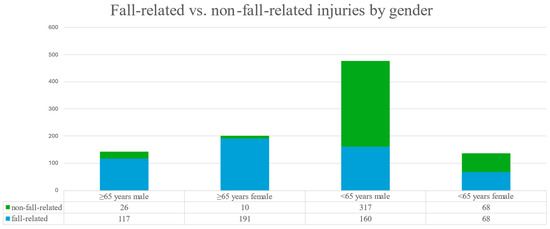 Distribution of fall-related vs. non-fall-related injuries by gender and age group.