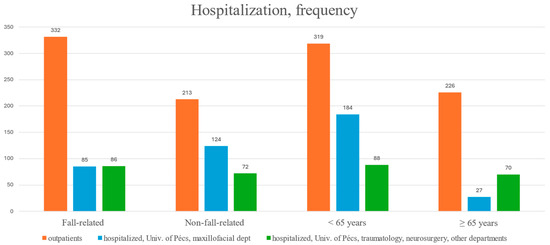 Patients with fall-related injuries were much more likely to be treated as outpatients, while non-fall-related injuries were more often managed in a hospital setting (Figure 5). Outpatient cases were ~6.6 times more likely to present fall-related injuries compared to hospitalized patients (Table 3, Figure 5). On average, one in five patients from the younger patient group (<65 years and one in ten patients from the elderly group (≥65 years) were hospitalized in our maxillofacial department (p < 0.001) (Table 3). However, when considering all kinds of hospitalizations (including those in other departments), 27.6% of elderly patients (≥65 years) and 20.4% of younger patients (<65 years) were treated as inpatients. Overall, elderly individuals were ~1.5 times more likely to be treated as inpatients; however, this occurred significantly less frequently in the maxillofacial department. The average length of hospitalization was 2.4 ± 1.3 days in our maxillofacial surgery department; it was 9.2 ± 3.7 days in other (traumatology, neurology, intensive care) departments.
