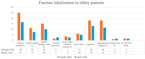Among elderly patients with fall-related injuries, the most frequently affected anatomical sites were the anterior maxillary wall (24.9%) the zygomaticomaxillary complex (17.9%), and the zygoma (17.9%). A statistically significant difference in fracture localization was found between elderly males and females (p = 0.047). Specifically, fractures involving the lateral maxillary wall (11.8% vs. 2.6%) and multiple maxillary walls (18.7% vs. 12.1%) were more frequent in women, while men had a higher proportion of zygomatic (24.1% vs. 17.6%) and zygomaticomaxillary (22.4% vs. 19.3%) fractures (Figure 7). These anatomical trends highlight the need for gender-sensitive diagnostic attention in geriatric trauma imaging.