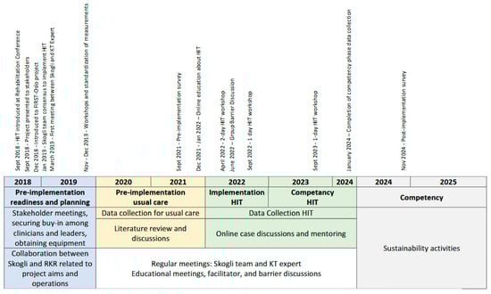 The implementation plan was developed collaboratively by a KT expert from RKR and the interdisciplinary team at Skogli. The planning was guided by the Knowledge-to-Action (KTA) framework, which facilitated a systematic process for translating knowledge into practice []. The KTA includes two components, visually represented as the knowledge creation funnel (the generation of evidence and tailoring this evidence for implementation), and the action cycle, which includes seven phases to guide implementation processes. The seven phases are as follows: the selection of the practice to be implemented and assessing the know–do gap; adapting knowledge to the local context; assessing barriers and facilitators to knowledge use; selecting and using KT interventions (i.e., implementation strategies); monitoring knowledge use (i.e., fidelity); evaluating outcomes; and sustaining the implemented practice []. The project efforts were categorized into three phases: pre-implementation, implementation, and competency []. While a general timeline guided these activities, this was adjusted as needed to address the evolving demands of the project. The timeline and KTA plan are shown in Figure 1 and Table 1.
