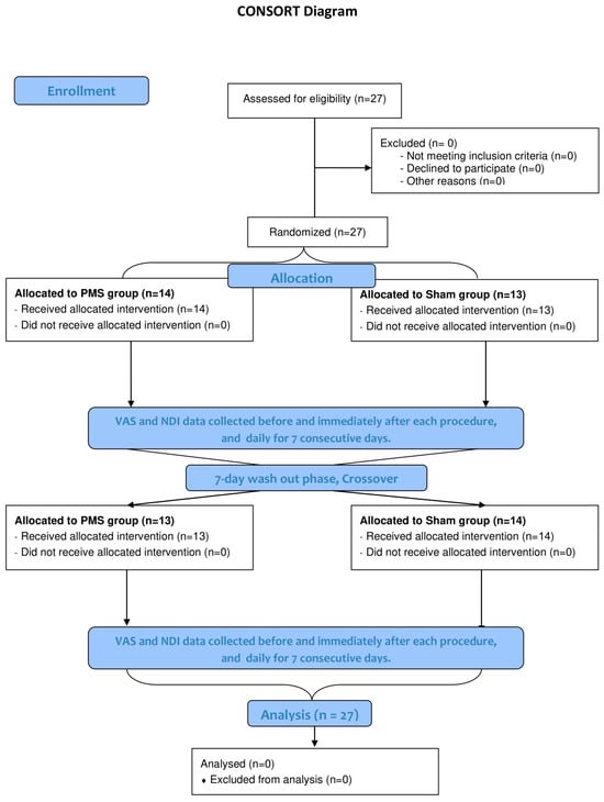 Participants were randomly assigned to the study groups using block randomization (block size of four), with allocation concealment ensured through sealed, opaque envelopes. The randomization process was conducted by a pharmacist who was not involved in any other aspect of this study. Fourteen participants were initially allocated to the PMS group, and thirteen were allocated to the sham group. After a seven-day period, the groups were crossed over to receive the alternate intervention (Figure 1).