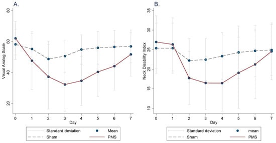 The mean baseline visual analog scale (VAS) was 61.8 ± 10.5, and the mean Neck Disability Index (NDI) score was 26.0 ± 6.3. The treatment effects of PMS and sham interventions are summarized in Table 2 and illustrated in Figure 1. No significant carryover or sequence effects were detected. Analysis using a linear mixed-effects model revealed a significant time effect, with reductions in both VAS and NDI scores on Days 2 and 3 in both the PMS and sham groups. There was no significant main effect of treatment group alone. However, a significant interaction effect between treatment and time was identified. Specifically, the PMS group showed a significantly greater reduction in VAS score from Day 1 to Day 7 compared to the sham group, with the greatest difference observed on Day 4 (−24.1 points compared to sham). Similarly, a significantly greater reduction in NDI score was observed from Day 1 to Day 6, with the greatest improvement in disability on Day 4 (−8.5 points compared to sham) (Table 2, Figure 2). There was no significant difference in diclofenac use between the two groups (Table 2).