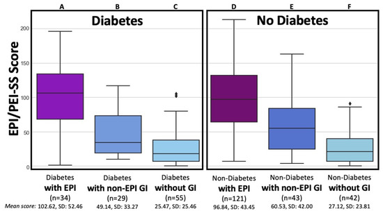 Total EPI/PEI-SS Scores by EPI, other non-EPI GI Conditions, and lack of GI conditions for People with and without Diabetes. The total EPI/PEI-SS scores is broken down among six groups categorized by the presence of diabetes and gastrointestinal (GI) condition: individuals with diabetes and EPI (Group A, n = 34, mean 102.62, SD 52.46); individuals with diabetes and other non-EPI GI conditions (Group B, n = 29, mean 49.14, SD 33.27); individuals with diabetes without any GI conditions (Group C, n = 55, mean 25.47, SD 25.46); individuals without diabetes but with EPI (Group D, n = 121, mean 96.84, SD 43.45); individuals without diabetes but with other non-EPI GI conditions (Group E, n = 43, mean 60.53, SD 42.00); and individuals without diabetes or GI conditions (Group F, n = 42, mean 27.12, SD 23.81).