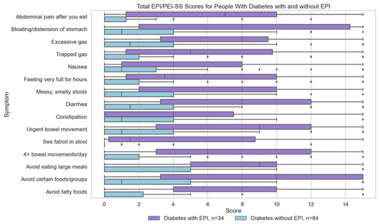 Individual Symptoms Scores for People with Diabetes With and Without EPI. Individual symptom scores for people with diabetes, distinguishing between those with Exocrine Pancreatic Insufficiency (EPI) (n = 34) and those without EPI (n = 84).