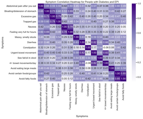Symptom Correlation Heatmap for People with Diabetes and EPI. This heatmap illustrates the correlation between various symptoms experienced by people with diabetes who also have Exocrine Pancreatic Insufficiency (EPI). Each cell in the matrix represents the correlation coefficient between two symptoms, with the intensity of the color indicating the strength of the correlation (ranging from −1 to 1).