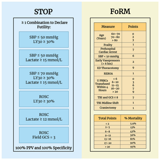 Figure 1. A summary of the STOP and FoRM criteria [13,15]. Abbreviations: ED (emergency department), FoRM (Futility of Resuscitation Measure), GCS (Glasgow Coma Scale), LY30 (lysis at 30 min), PRBC (packed red blood cell), REBOA (resuscitative endovascular balloon occlusion of the aorta), ROSC (return of spontaneous circulation), SBP (systolic blood pressure), STOP (Suspension of Transfusion and Other Procedures), TBI (traumatic brain injury). Created in BioRender. Al-fadhl, M. (2025) https://BioRender.com/bo67sz0 (accessed on 18 June 2025).