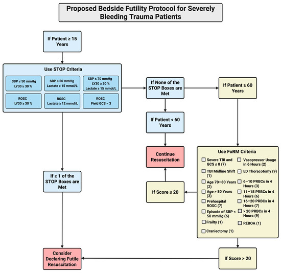 Figure 2. A flowchart of suggested steps, based on STOP and FoRM protocols, when faced with the decision to declare futility in bleeding trauma patients. Abbreviations: FoRM (Futility of Resuscitation Measure), GCS (Glasgow Coma Scale), LY30 (lysis at 30 min), PRBC (packed red blood cell), REBOA (resuscitative endovascular balloon occlusion of the aorta), ROSC (return of spontaneous circulation), SBP (systolic blood pressure), STOP (Suspension of Transfusion and Other Procedures), TBI (Traumatic Brain Injury) Created in BioRender. Al-fadhl, M. (2025) https://BioRender.com/n6lg8hm (accessed on 18 June 2025).