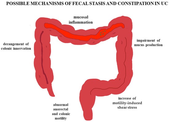 - Miller, C.; Emmanuel, A.; Zarate-Lopez, N.; Taylor, S.; Bloom, S. Constipation in ulcerative colitis: Pathophysiology and practical management. Frontline Gastroenterol. 2020, 12, 493–499. [Google Scholar] [CrossRef] [PubMed]