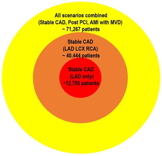 Second, validating vessel-specific FFR cutoffs would require prohibitively large, dedicated outcome trials. Even when using the most conservative—that is, the highest observed—event rates from prior vessel-level studies, the estimated sample sizes remain immense. For example, in stable CAD, approximately 12,755 patients would be required for the LAD [20], 11,104 for the RCA, and 16,585 for the LCx, totaling over 40,000 patients. Post-PCI studies would add another 19,000 patients [32,33], and AMI with MVD would require roughly 12,000 more [45,46]. Altogether, these scenarios would necessitate over 70,000 participants, underscoring the practical infeasibility of conducting separate RCTs to define FFR thresholds for each coronary vessel (Figure 3).