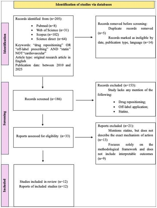 A total of 205 studies were identified from the databases, but only 12 met the inclusion criteria. These criteria were as follows: (1) original research articles in English addressing the off-label use or repositioning of statins, and (2) studies involving statin therapy for indications beyond their primary cardiovascular use. Studies were excluded if they were duplicates, lacked information on statin repurposing or off-label use, or focused on statins solely as comedications rather than as the main intervention.