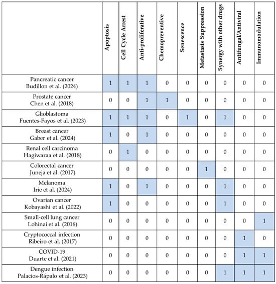 Mechanistic effect types of statins across repurposed non-cardiovascular indications. (Cells marked with “1” indicate that the effect was observed or proposed in the referenced study; cells marked with “0” indicate no direct evidence or mention of that mechanism in the given context) [17,18,19,20,21,22,23,24,25,26,27,28].