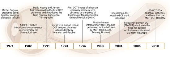 Key milestones in the development of Optical Coherence Tomography (OCT): this timeline highlights the major scientific and technological advances that led to the development and clinical adoption of OCT. From the initial concept of using light for biological imaging in the 1970s to the introduction of low-coherence interferometry and the first in vivo human coronary imaging. The evolution from time-domain to frequency-domain OCT enabled real-time intracoronary imaging without balloon occlusion, paving the way for widespread clinical use and regulatory approval.