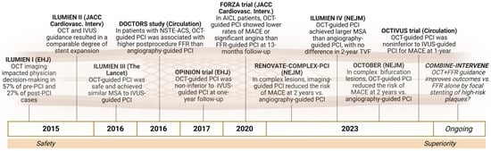Key clinical trials supporting the integration of OCT in PCI practice: this timeline illustrates the progression from feasibility and safety to comparative efficacy and procedural superiority of OCT-guided PCI in both simple and complex coronary lesions. These studies consistently demonstrated the ability of OCT to improve decision-making, stent sizing, and optimization, leading to better anatomical and physiological outcomes.
