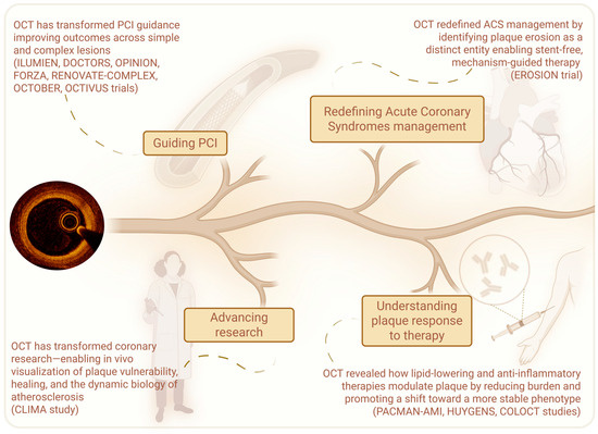 OCT has gone far beyond its initial role as a simple guide to PCI. It has transformed the way we approach ACS, shifting treatment from uniform protocols to mechanism-driven, lesion-specific strategies. At the same time, it has deepened our understanding of how therapies—particularly lipid-lowering and anti-inflammatory agents—modulate plaque characteristics, promoting a transition toward more stable phenotypes. Finally, its unparalleled resolution has enabled the in vivo investigation of coronary plaque biology with a level of detail previously reserved for histopathology. Through OCT, atherosclerosis is no longer viewed as a static disease but as a dynamic process marked by phases of vulnerability, rupture, healing, and progression. This shift has expanded our understanding of CAD, revealing the temporal and structural complexity of plaque behavior and offering new frameworks for risk assessment and therapeutic targeting (Figure 3).