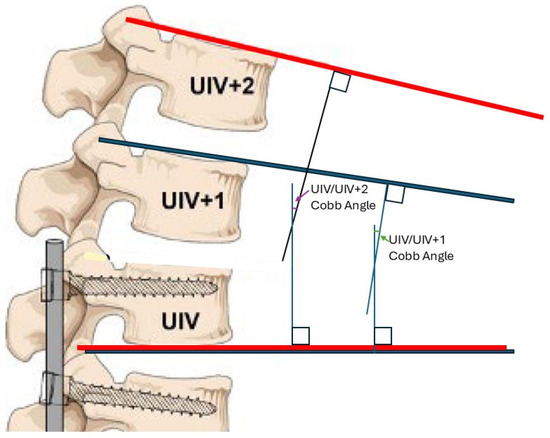 Diagram of the Cobb angle between the upper instrumented vertebrae (UIV) and the UIV+1 (blue) or UIV+2 (red). Figure adapted from Boeckenfoerde et al. with permission per Creative Commons (CC BY) licensing guidelines [14].