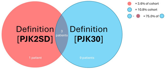 Venn diagram illustration of the overlapping relationship between definition (3) PJK2SD and (6) PJK30, showing that 75.0% of PJK+ patients by (6) PJK30 are not accounted for by (3) PJK2SD.