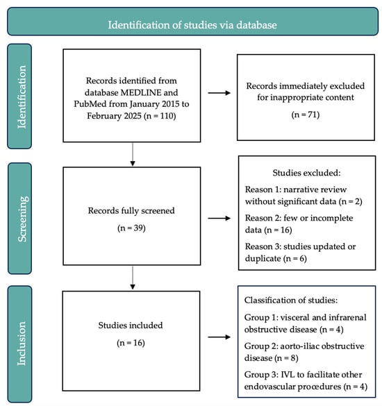 Narrative reviews and articles with few or incomplete data were excluded. Updated studies were excluded as well. Inclusion criteria involved the application of IVL in aorta or aorto-iliac district, specifying the localization and the underlying disease of the treated patients.