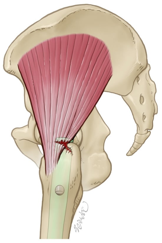 - McConnell, T.; Tornetta Iii, P.; Benson, E.; Manuel, J. Gluteus medius tendon injury during reaming for gamma nail insertion. Clin. Orthop. Relat. Res. 2003, 407, 199–202. [Google Scholar] [CrossRef]