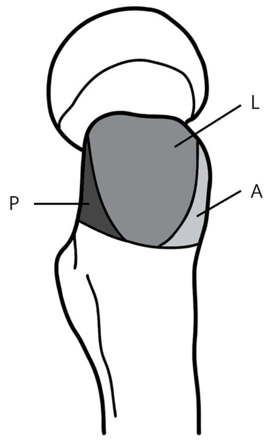 Three facets of greater trochanter. A is the anterior facet, L is the lateral facet, P is the posterior facet.