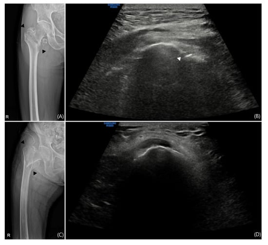 Comparison of X-ray and Ultrasound in Patients with Trochanteric Fracture. Not all trochanteric fractures are accompanied by greater trochanteric (GT) fractures. (A) The X-ray image of a patient with a trochanteric fracture and (B) the short-axis (SAX) view ultrasound image of the GT region from the same patient are shown. A GT fracture is visible on the X-ray and is also confirmed on sonography. If a tear is observed in this region, it is unlikely to have occurred iatrogenically. In another patient with a trochanteric fracture, (C) the X-ray image and (D) the SAX view ultrasound image show no evidence of a GT fracture on sonography. If a gluteal tendon tear is observed here, it suggests that the tear is of iatrogenic origin.