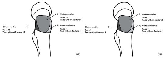 In 13 patients without trochanteric fractures, tendon tears were observed on the affected side in 11 patients: five cases in the A facet, seven cases in the L facet, and four cases in the P facet. Among these, in cases without concurrent fractures in the same facet, there were five cases in the A facet, six cases in the L facet, and four cases in the P facet. After excluding duplicates, a total of 10 cases of tendon tears without fractures on the affected side were identified (Figure 6B).