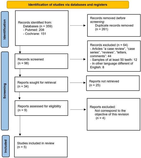 Figure 1 shows the selection process for the included studies. Following the initial database search, 359 records were identified. After applying the defined inclusion criteria, 34 articles were selected for further evaluation. Of these, 25 reports were not retrieved and four were excluded because they do not correspond to the objective of this revision. Ultimately, five studies met all inclusion criteria and were included in the present systematic review [22,23,24,25,26].