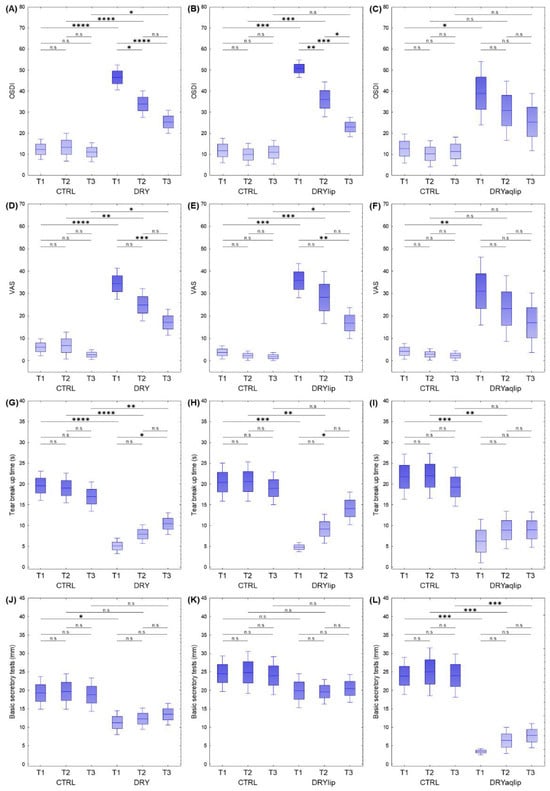 Finally, we evaluated the potential changes in the BST attribute by measuring the Schirmer wetting length in mm. Interestingly, in contrast to all the other clinical diagnostic tests results in this study, the BST was overall not significantly affected, except for the significant changes in the DRY and DRYaqlip subgroups compared to their respective CTRL at baseline (DRY_T1 vs. CTRL_T1, p = 3.4 × 10−2; DRYlip_T1 vs. CTRL_T1, p > 0.05; DRYaqlip_T1 vs. CTRL_T1, p = 1.3 × 10−4) (Figure 1J–L). Generally, no significant differences in BST attributed to the use of Thealoz® Duo were observed in all the DED subgroups at the different time-points.