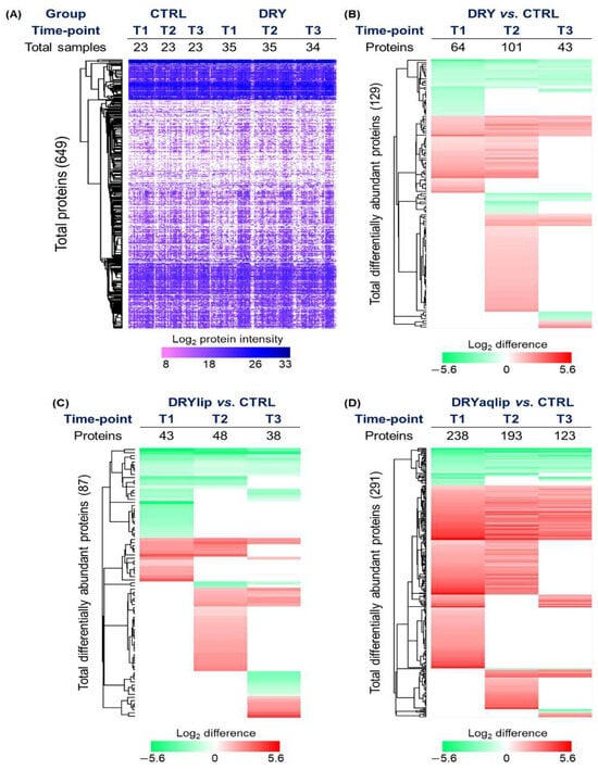 Label-free quantification analysis identified a total of 649 tear proteins (Figure 2A and Supplementary Data S3). In the DRY vs. CTRL, as many as 64, 101, and 43 proteins were significantly differentially abundant at T1, T2, and T3, respectively (Figure 2B and Supplementary Data S4a).