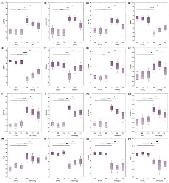 Box plots show the significantly differentially abundant protein profiles in the moderate to severe DED (DRY), evaporative DED (DRYlip) and severe aqueous-deficient with evaporative DED (DRYaqlip) compared to healthy controls (CTRL) at different time-points ((T1, baseline), day 28 ± 4; T2) and 3 (day 56 ± 4; T3)) following proteomics analysis: (A) Protein S100-A9 (S100A9), (B) Alpha-1-antitrypsin (SERPINA1), (C) Apolipoprotein A-I (APOA1), (D) Metalloproteinase inhibitor 1 (TIMP1), (E) TIMP1, (F) Zymogen granule protein 16 homolog B (ZG16B), (G) Protein S100-A8) (S100A8), (H) APOA1, (I) S100A8, (J) S100A9, (K) SERPINA1, (L) Complement C4-B/C4A (C4B/C4A), (M) Serum albumin (ALB), (N) TIMP1, (O) ZG16B, and (P) Proline-rich protein 4 (PRR4). The y-axis represents the intensities of the proteins in each individual sample. Boxes represent the mean ± SE and mean ± 1.96SE. * p < 0.05; ** p < 0.001; *** p < 0.0001; **** p < 0.00001; n.s: non-significant.