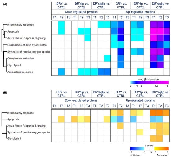 Hierarchical clustering of the significant biological functions and canonical pathways associated with the DAP in the designated DED groups at different time-points. (A) The significance of enrichment p-value was calculated using Benjamini–Hochberg (B-H) multiple testing correction (one-sided Fisher’s exact test, −log B-H p-value > 1.3) and is scaled by color intensity. (B) Overall z-scores are represented by the color orange, which indicates activation, and blue indicates inhibition of the signaling pathways/biological functions. Abbreviations: moderate to severe DED (DRY); subgroups: evaporative DED (DRYlip) and severe aqueous-deficient with evaporative DED (DRYaqlip), control groups (CTRL), different time-points (T1, baseline), (day 28 ± 4; T2) and (day 56 ± 4; T3).