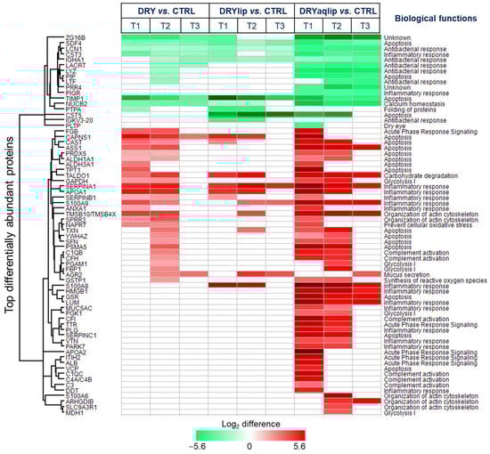 Heat map depicts the hierarchical clustering of the biological functions of the top significantly differentially abundant tear proteins identified based on the log2 difference in the designated dry eye (DED) subgroups compared to control (CTRL) at different time-points. Up-regulated proteins are shown in red, and the down-regulated proteins are in green. Different color intensities correspond to the degree of log2 difference. Abbreviations: moderate to severe DED (DRY); subgroups: evaporative DED (DRYlip) and severe aqueous-deficient with evaporative DED (DRYaqlip), control groups (CTRL), different time-points (T1, baseline), (day 28 ± 4; T2) and (day 56 ± 4; T3).