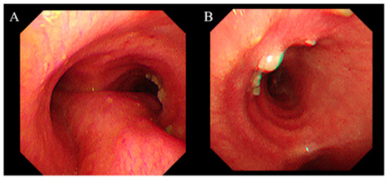 Bronchoscopic findings of the right main bronchus. Bronchoscopy performed on post-transplant day 36 shows multiple white plaques on the right main bronchial mucosa. (A) View from the carina. (B) View of the right main bronchus. Tissue samples were obtained via lesion biopsy and bronchoalveolar lavage from the right middle lobe.