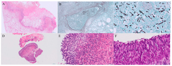 On PTD 28, contrast-enhanced CT revealed worsening of the right middle lobe lesion and a new nodular endobronchial lesion in the right main bronchus (Figure 1C). Bronchoscopy revealed multiple whitish elevated lesions (Figure 2A,B). Cytopathological examination of bronchoalveolar lavage (BAL) fluid revealed septate hyphae with acute-angle branching, suggestive of Aspergillus species, although BAL galactomannan was negative. A presumptive diagnosis of COVID-19-associated TBA and pulmonary mucormycosis was established [5]. Liposomal amphotericin B (5 mg/kg/day) was initiated, and the dose of corticosteroids was tapered. On PTD 37, right middle lobectomy with wedge resection of the right upper lobe was performed for diagnostic confirmation and source control. Histopathological examination confirmed invasive mucormycosis (Figure 3A–C) and Rhizopus microsporus was cultured. Concurrently, biopsy of the right bronchial lesion revealed septate hyphae, and Aspergillus fumigatus complex was isolated, as shown in Figure 3D–F. Thus, the final diagnosis of pathologically confirmed COVID-19-associated TBA and pulmonary mucormycosis was established [5].