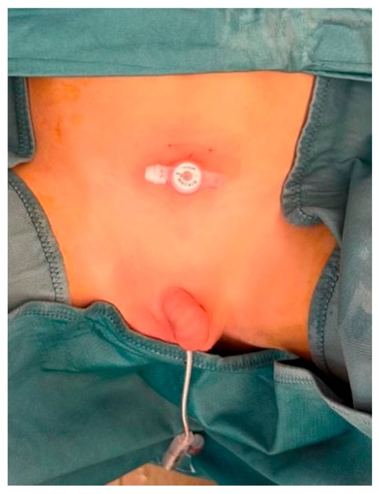 BC placement was carried out endoscopically under general anesthesia, following our modified Subramaniam’s technique [,,]. After inserting a rigid cystoscope, the bladder was filled with isotonic saline. The bladder wall was fixed to the abdominal wall using an anchoring prolene suture. A 10 ch Cystofix® (B. Braun, Bethlehem, PA, USA) needle was then introduced percutaneously in the suprapubic region to advance a guidewire into the bladder. The guidewire was retrieved through the urethra, the suprapubic tract was sequentially dilated, and an appropriate-sized cystostomy button was advanced and secured (Figure 1). In six patients who already had a suprapubic catheter in place, the existing tract was used to introduce the guidewire, facilitating the same endoscopic technique.