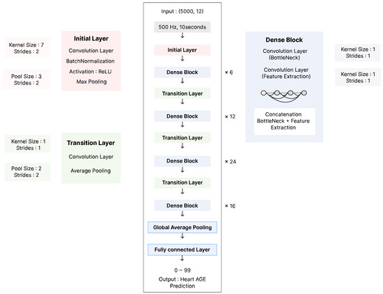 The ECG signals, sampled at 500 Hz over a 10-s window, pass through an initial layer, which consists of a convolutional layer with batch normalization and ReLU activation, followed by max pooling. The extracted features are then processed through multiple dense blocks and transition layers. Each dense block consists of a bottleneck convolutional layer and multiple convolutional layers for feature extraction, with concatenation operations ensuring efficient information flow. Transition layers include convolutional layers and average pooling to progressively reduce the feature map dimensions. The final representations are aggregated using global average pooling, and the model outputs a continuous age prediction (ranging from 0 to 99) through a fully connected layer.