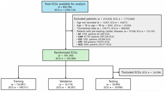 This study was conducted using ECG data from patients who visited a single tertiary institute in the Republic of Korea between January 2010 and January 2024, under the approval of the Institutional Review Board (IRB No. 2020-01-007). Data collection was conducted according to the principles outlined in the Declaration of Helsinki (2013) and Good Clinical Practices. Informed consent was waived by the IRB due to the retrospective design of the study. Initially, 2,065,124 ECGs were available for analysis. To ensure data quality and relevance, patients with missing age information, those younger than 18 years or older than 90 years, and those with significant cardiac disease conditions were excluded. The specific significant cardiac conditions excluded were aborted sudden cardiac death, cardioverter-defibrillator (ICD) or cardiac resynchronization therapy (CRT) implantation before ECG acquisition, and atrial fibrillation (AF). For coronary artery disease (CAD), individuals with stenosis of ≥50% on coronary angiography or coronary computed tomography or a history of revascularization were excluded, whereas those with stenosis of <50% without prior interventions were retained to ensure a representative real-world population. For valvular heart disease, individuals with moderate to severe valvular heart disease were excluded. Patients with a left ventricular ejection fraction (LVEF) <50% on echocardiography or those diagnosed with cardiomyopathy were also excluded. Additionally, unmatched ECGs lacking patient records, diagnoses, or hospital identifiers and ECGs containing duplicate or corrupted signals were removed.