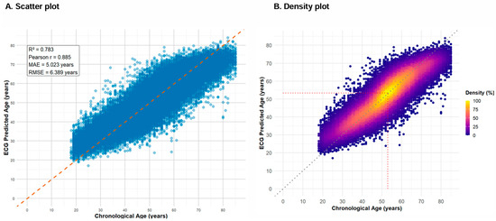 Correlation Between ECG Predicted Age and Chronological Age. (A) A scatter plot depicting the correlation between ECG-predicted age and chronological age. The dashed orange line represents the line of identity (y = x), indicating perfect agreement. Model performance metrics include R2 = 0.783, Pearson correlation coefficient (r) = 0.885, mean absolute error (MAE) = 5.023 years, and root mean square error (RMSE) = 6.389 years. (B) A density-colored scatter plot visualizes the distribution of predicted ECG-age. The highest density was observed at a chronological age of 53 years, where the corresponding ECG-predicted age was 53.3 years. This point is marked by the intersection of the red dotted lines, highlighting the peak density region in the plot.