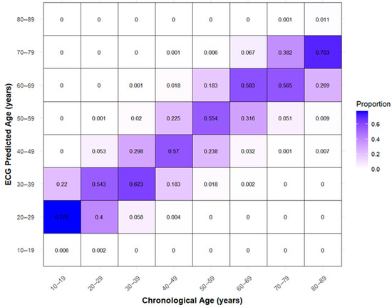 The highest density was observed at CA 53 years, where the corresponding ECG-heart age was 53.3 years. Predictions tended to be overestimated in individuals younger than 30 years and underestimated in those older than 70 years. The confusion matrix shows systematic classification patterns across age groups (Figure 4).